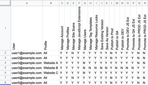 この例では、user3がUser列に3回表示されます。他のユーザーとは異なり、アカウント上のすべてのプロファイルで同じ権限を持つuser3は、Website A、Website B、Website Cのプロファイルで異なる権限を持っています。そのため、スプレッドシートの別の行にuser3のプロファイル権限が含まれています。