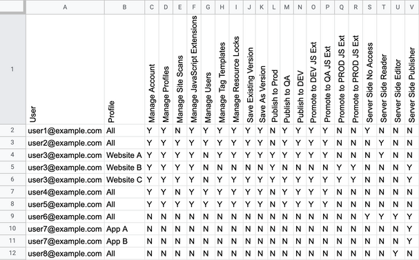この例では、user6、user7、user8はクライアントサイドには権限がなく、スプレッドシートに手動で追加する必要がありました。また、user7はサーバーサイドのプロファイルApp AとApp Bで異なる権限を持っているため、user7のプロファイル権限のためにスプレッドシートに別の行が作成されました。