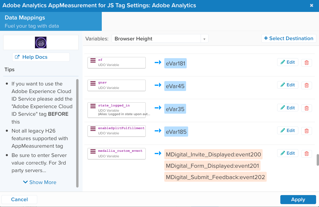 マッピングは、データレイヤーの変数からベンダータグの対応する宛先変数にデータを送信するプロセスです。詳細については、About data mappingsを参照してください。