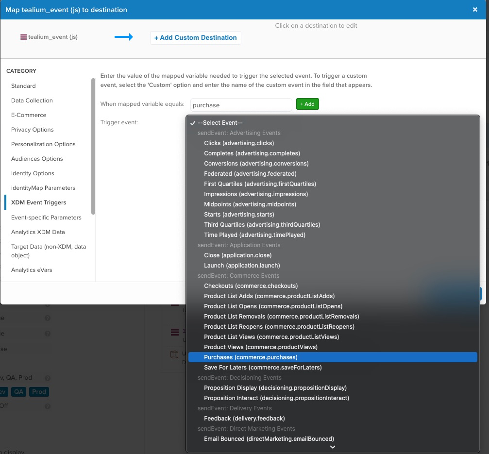 tealium_eventを選択し、Select a Destinationをクリックします。 - CategoryセクションでXDM Event Triggersを選択します。