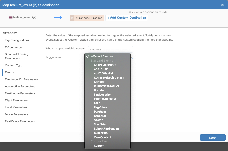 Purchaseを選択します。これは、tealium_eventが購入と等しい場合にトリガーされるイベントです。 組み込みのE-Commerce拡張のマッピングでカバーされていない追加の購入データを送信する場合は、Custom Parametersを使用して追加の購入データをマッピングします。