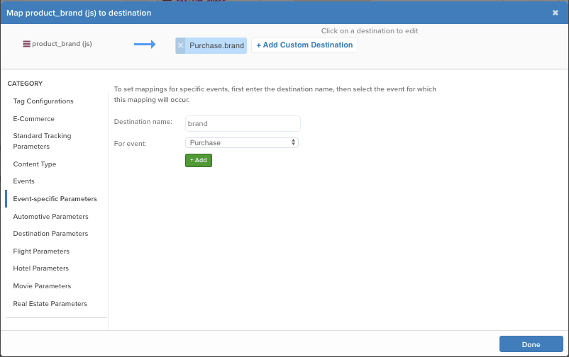 product_brandを選択し、Select a Destinationをクリックします。 - CategoryセクションでEvent specific Parametersを選択します。