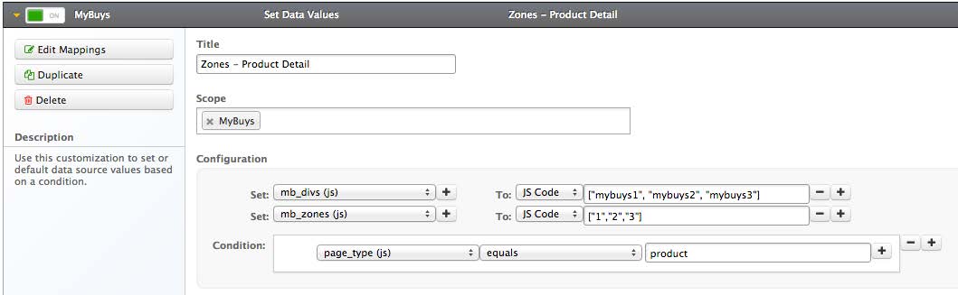 この例では、mb_divsとmb_zonesを新しい変数として定義し、それぞれの値を配列として構成しています。配列はJSコードの割り当てオプションを使用してポピュレートできます。ゾーンは、ページごとに構成することができます。条件ごとに複数の拡張機能を作成することで、ゾーンを構成できます。