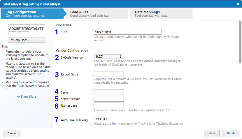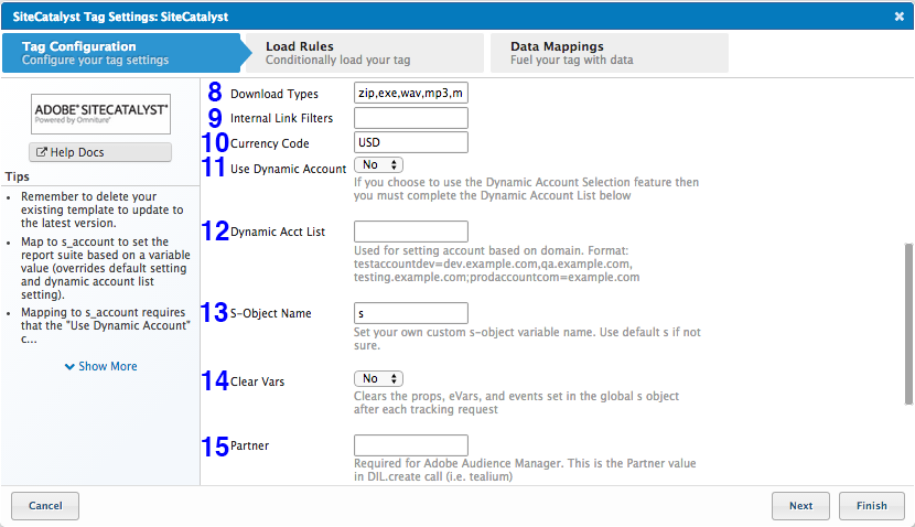 以下はSiteCatalystタグの構成リストです。構成の値は、SiteCatalystから提供されたs_codeファイルで見つけることができます。