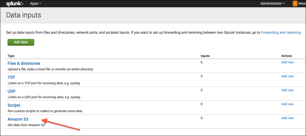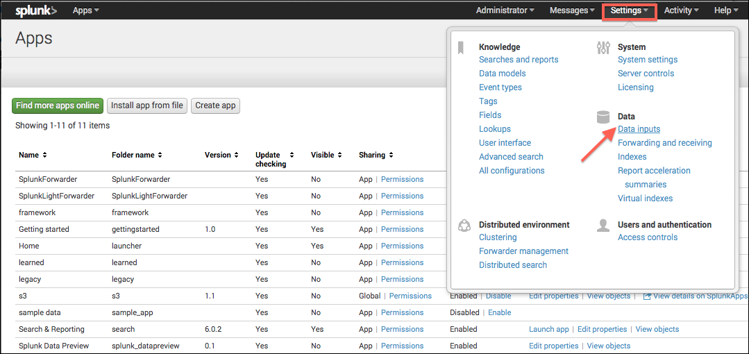 - Splunkインターフェースの右上隅にある構成をクリックします。ドロップダウンメニューからデータ入力をクリックします。