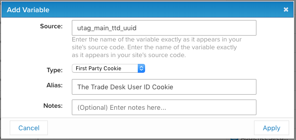 - Tealiumアカウント: The Trade DeskユーザーIDを別のアカウントに送信する場合を除き、空白のままにします。