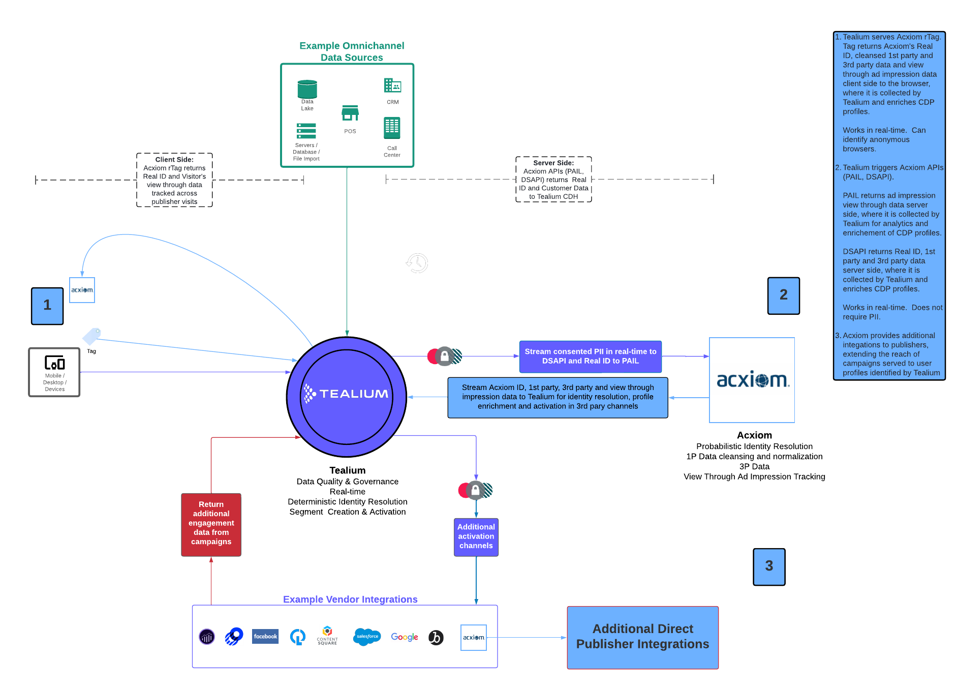 Tealiumは、プラットフォーム全体で多数のアイデンティティパートナーの統合にアクセスできます:iQタグ管理、EventStream、データソース、AudienceStream、および関数。これらのソースから情報を取得し、それを訪問と顧客のプロファイルの明確なビジョンに組み合わせる作業は大変な作業になる場合があるため、Tealiumは複数のソースからのアイデンティティプロバイダーデータの統合プロセスをスムーズかつ簡単にするためにここにあります。