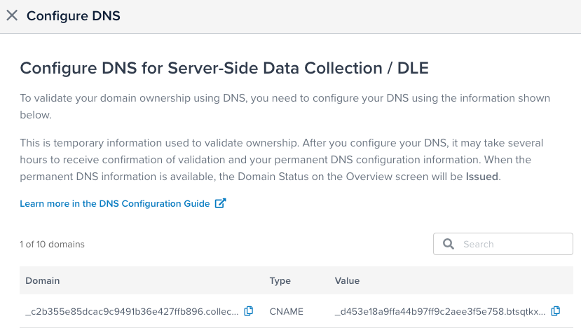 First-Party Domains OverviewのドメインステータスがIssuedに変更されると、ドメインは使用準備が整います。ドメインステータスがIssuedに変更された後、Tealium Collectでファーストパーティドメインを使用するためにエンドポイント構成を更新する必要があります。詳細については、Update endpoint configurationsを参照してください。