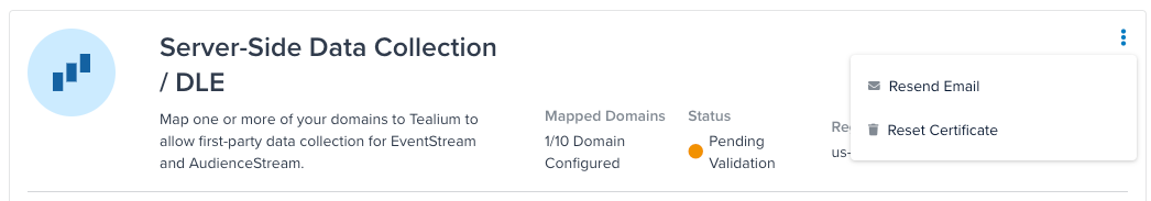 サーバーサイドデータ収集では、ドメイン証明書は構成時に選択した地域のTealiumエンドポイントに構成され、保存されます。選択した地域がプロファイルの地域と異なる場合、イベントと訪問のデータはファーストパーティドメイン地域で収集され、プロファイルの構成地域に転送されます。