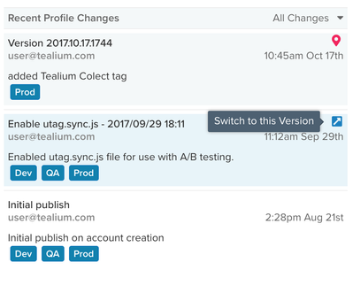 すべての変更ドロップダウンリストをクリックして、環境ごとにビューをフィルタリングします。表示されるバージョンは、選択した環境を反映します。 - バージョンの切り替え バージョンの右上隅にある矢印をクリックして、そのバージョンのアカウント/プロファイルにすばやく切り替えます。