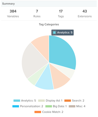 サマリーセクションでは、アクティブなタグと非アクティブなタグの合計数が円グラフで表示されます。グラフの任意のエリアにマウスを置くと、タグカテゴリ名とそのカテゴリに構成したタグの数が表示されます。変数、ルール、タグ、拡張機能の合計数が上部に表示されます。任意の項目をクリックして、その構成セクションに直接移動します。