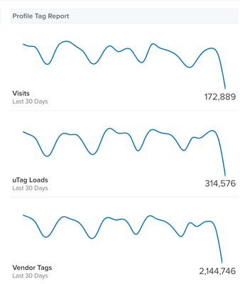 プロファイルタグレポートセクションでは、訪問、uTagのロード、ベンダータグのロードの概要が表示されます。任意のグラフの右上にある矢印をクリックして、タグレポーティングに直接移動します。そこから、ドロップダウンカレンダーを使用して視点を調整したり、日付範囲を変更したりできます。異なる視点と日付範囲を表示すると、基本的なIT目的のための組織のタグ使用の一般的なビューが得られます。