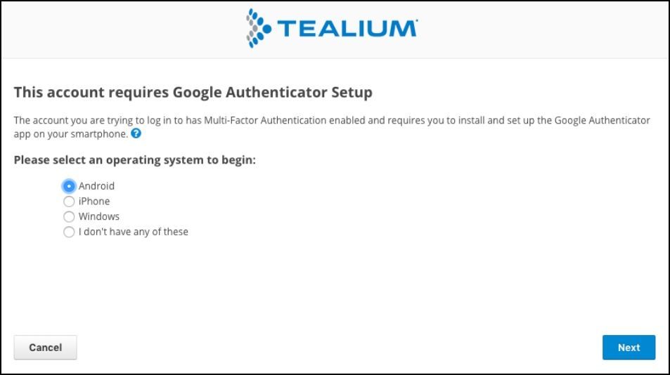 Tealium MFAは、GoogleとWindowsの認証アプリケーションからのトークンのみを受け付けます。デバイスに認証アプリケーションをインストールする方法の詳細については、次のリンクをクリックしてください: