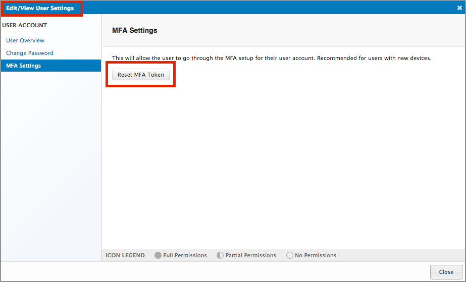 - 左側のパネルでMFA構成をクリックし、MFAコードのリセットをクリックします。