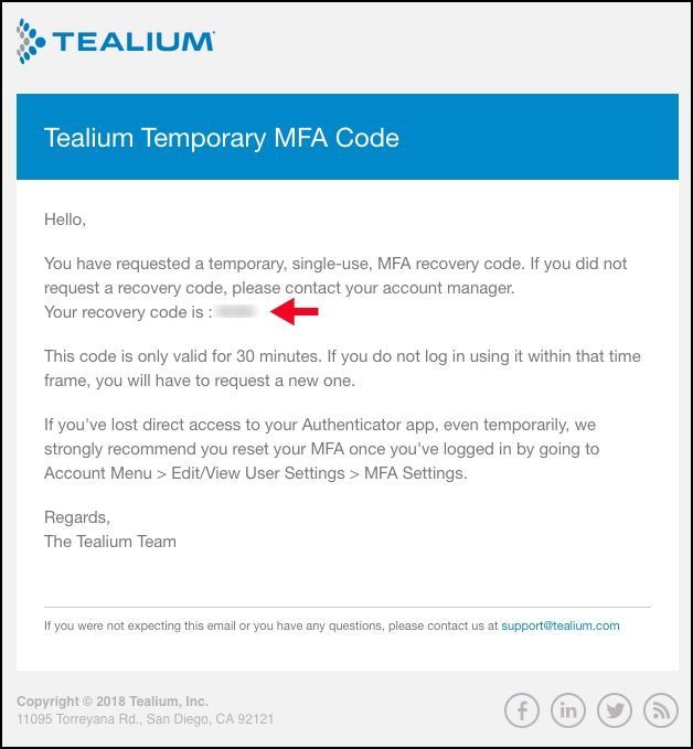 - メールを開き、サポートからの新しいメールTealium Temporary MFA Codeを開きます。