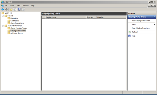 - Trust Relationshipsフォルダを展開し、Relying Party Trustを選択します。Relying Party Trusts画面で、Add Relying Party Trustをクリックします。