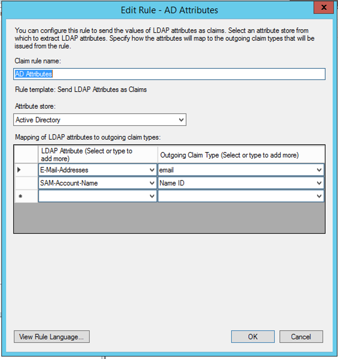 - セットアップウィザードを閉じると、Edit Claim Rules構成ウィンドウが開きます。Add Ruleをクリックします。
