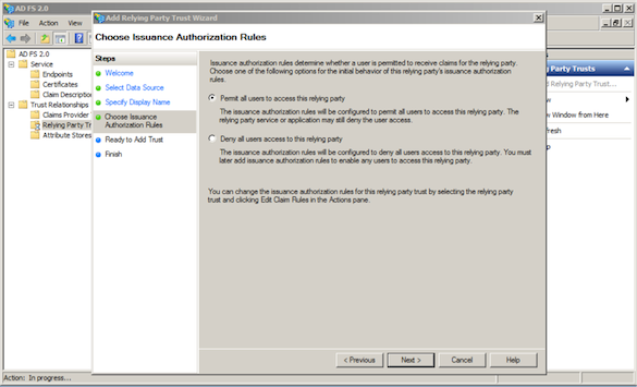 - Choose Issuance Authorization Rules画面で、Permit all users to access this relying partyを選択します。