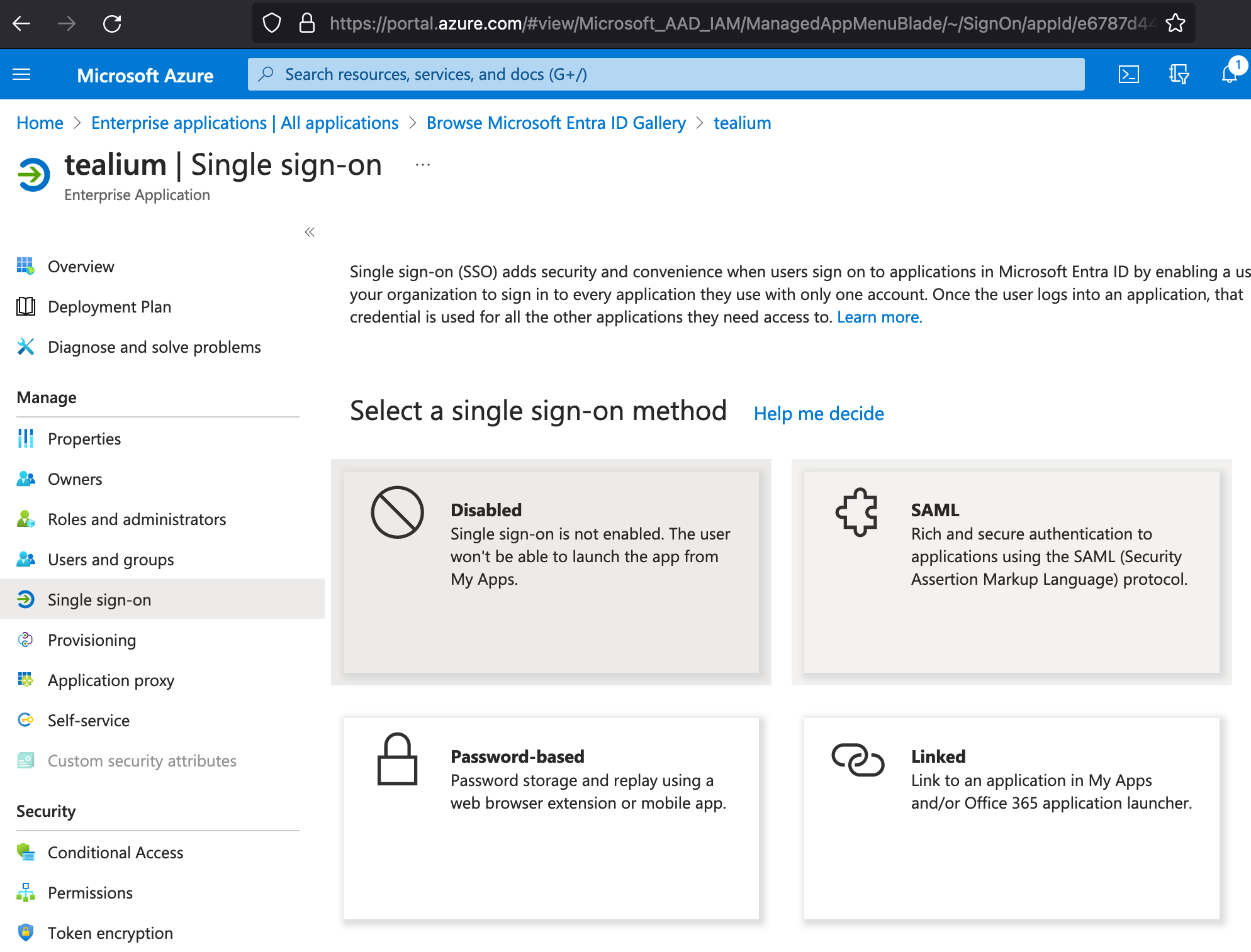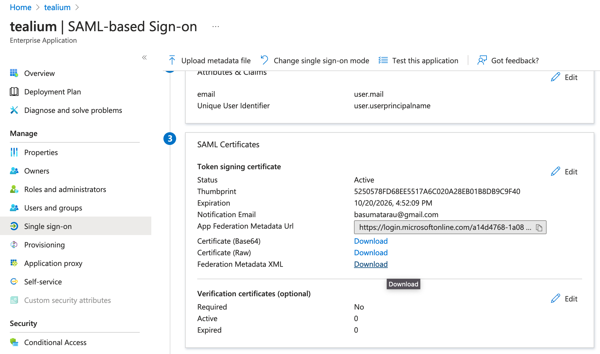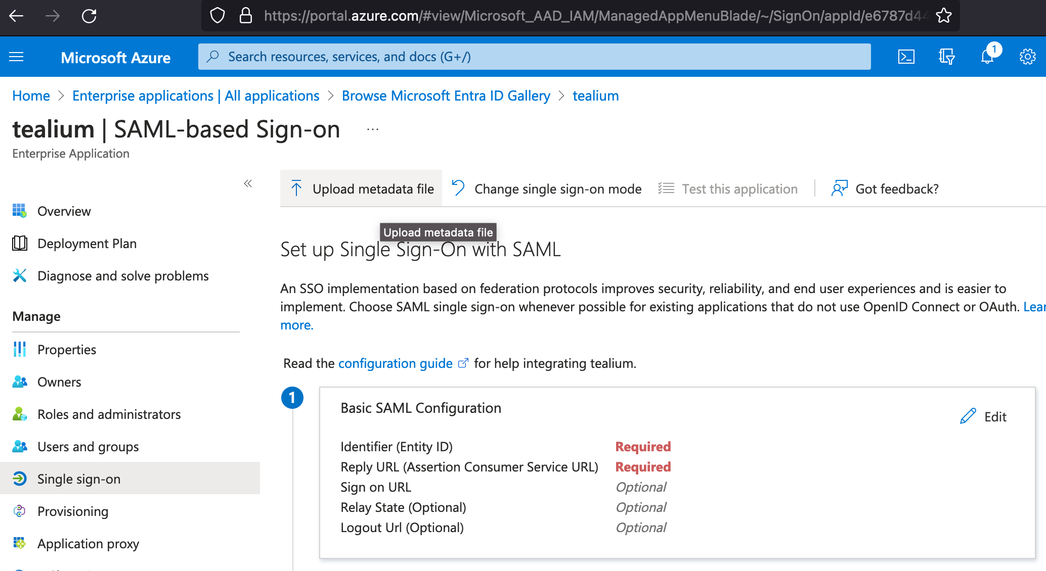 SSOの構成:ステップ1でTealiumのメタデータファイルをダウンロードした後、以下の手順を完了してTealium SSOでAzureを使用するように構成します: