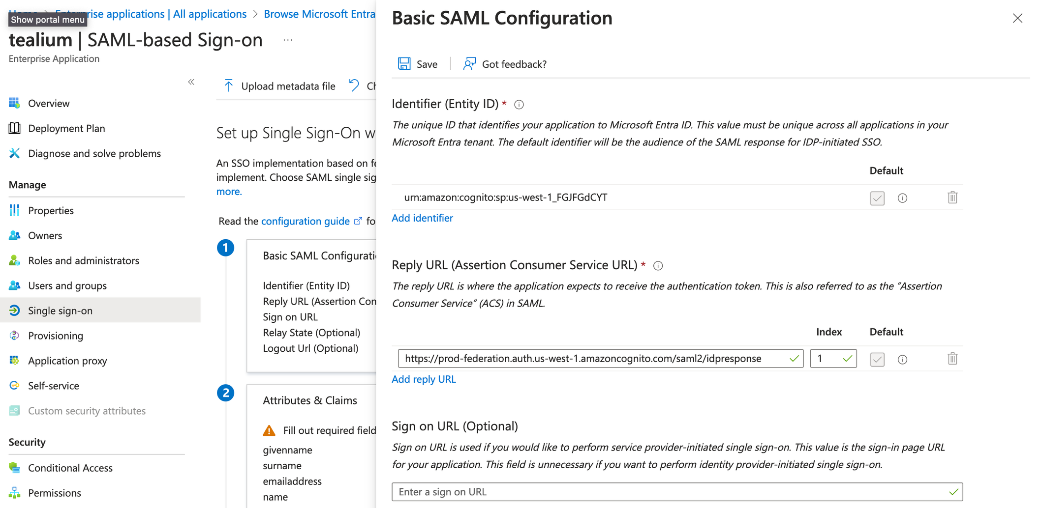 - Tealiumのメタデータファイルをアップロードすると、アップロードしたファイルから基本的なSAML構成情報が表示されます。これらの構成を変更する必要はありません。