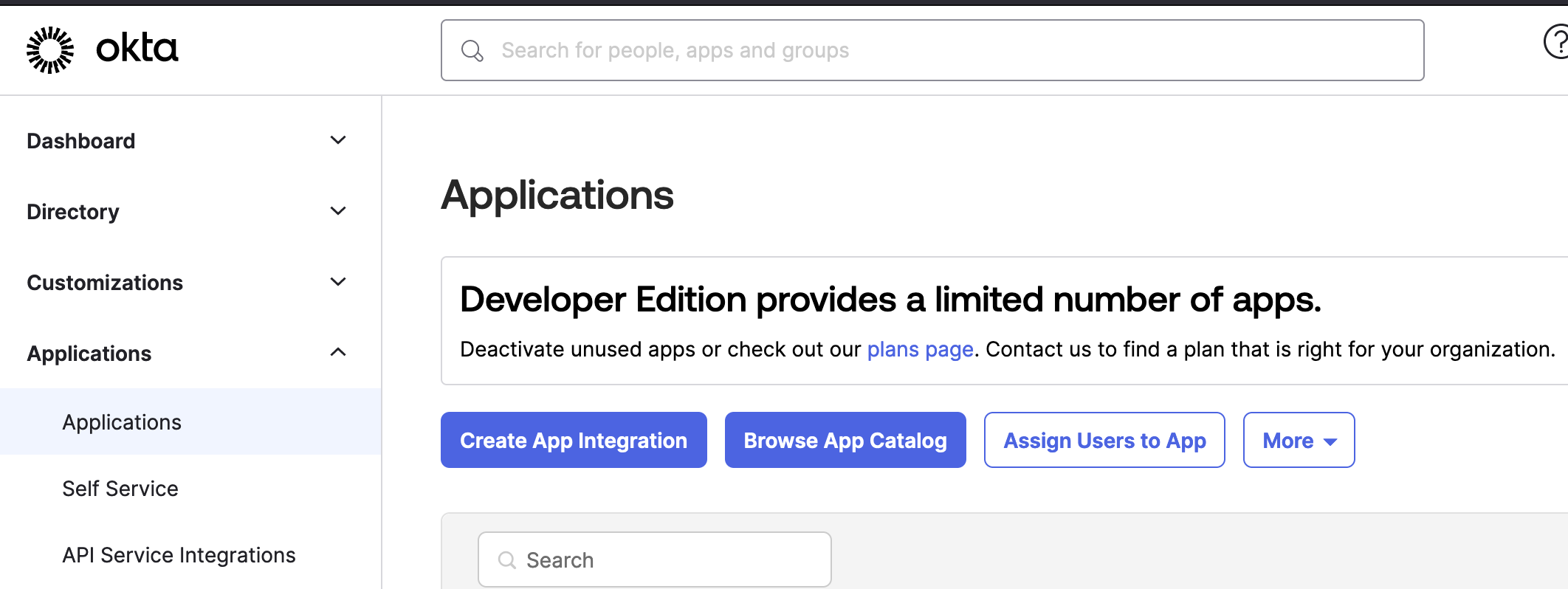 metadata.xmlを探し、ローカルでファイルを開きます。このファイルはOktaの構成で参照する必要があります。 - Oktaアカウントにログインし、Applications > Applicationsに移動し、Create App Integrationをクリックします。
