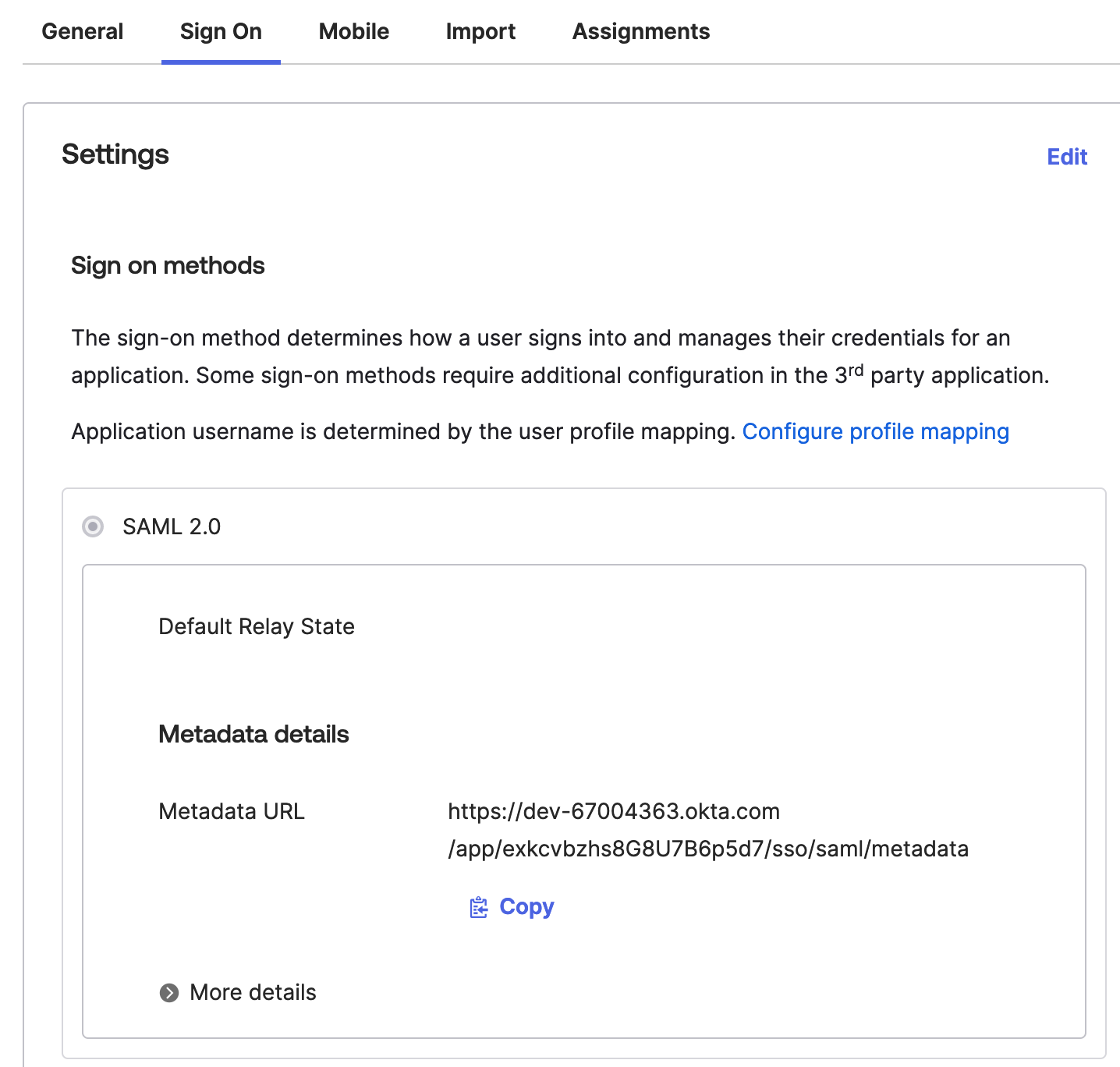 - Sign Onタブで、Metadata URLをコピーします。