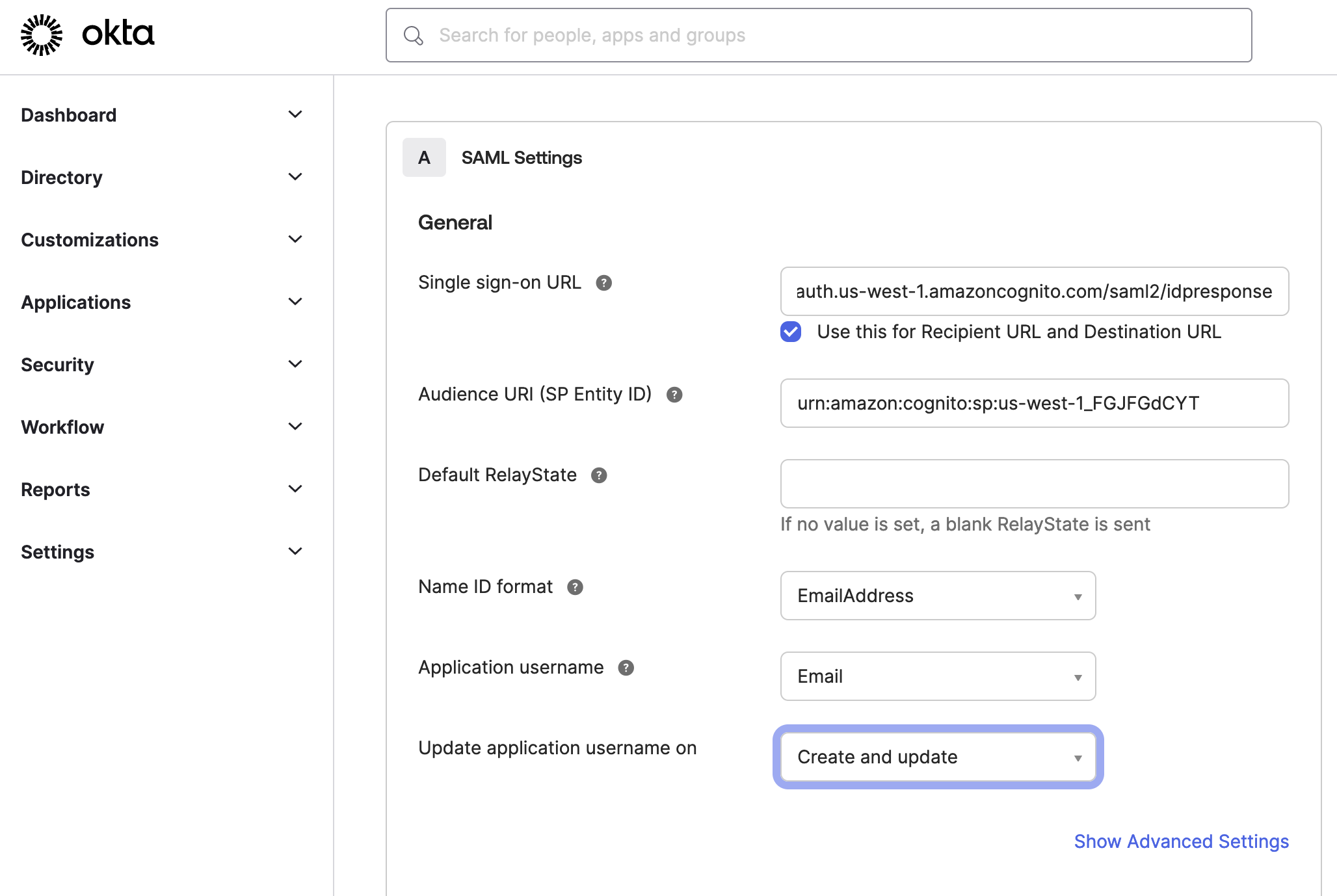 EntityDescriptionで、entityIDの値を使用します:urn:amazon:cognito:sp:us-west-1_FGJFGdCYT。