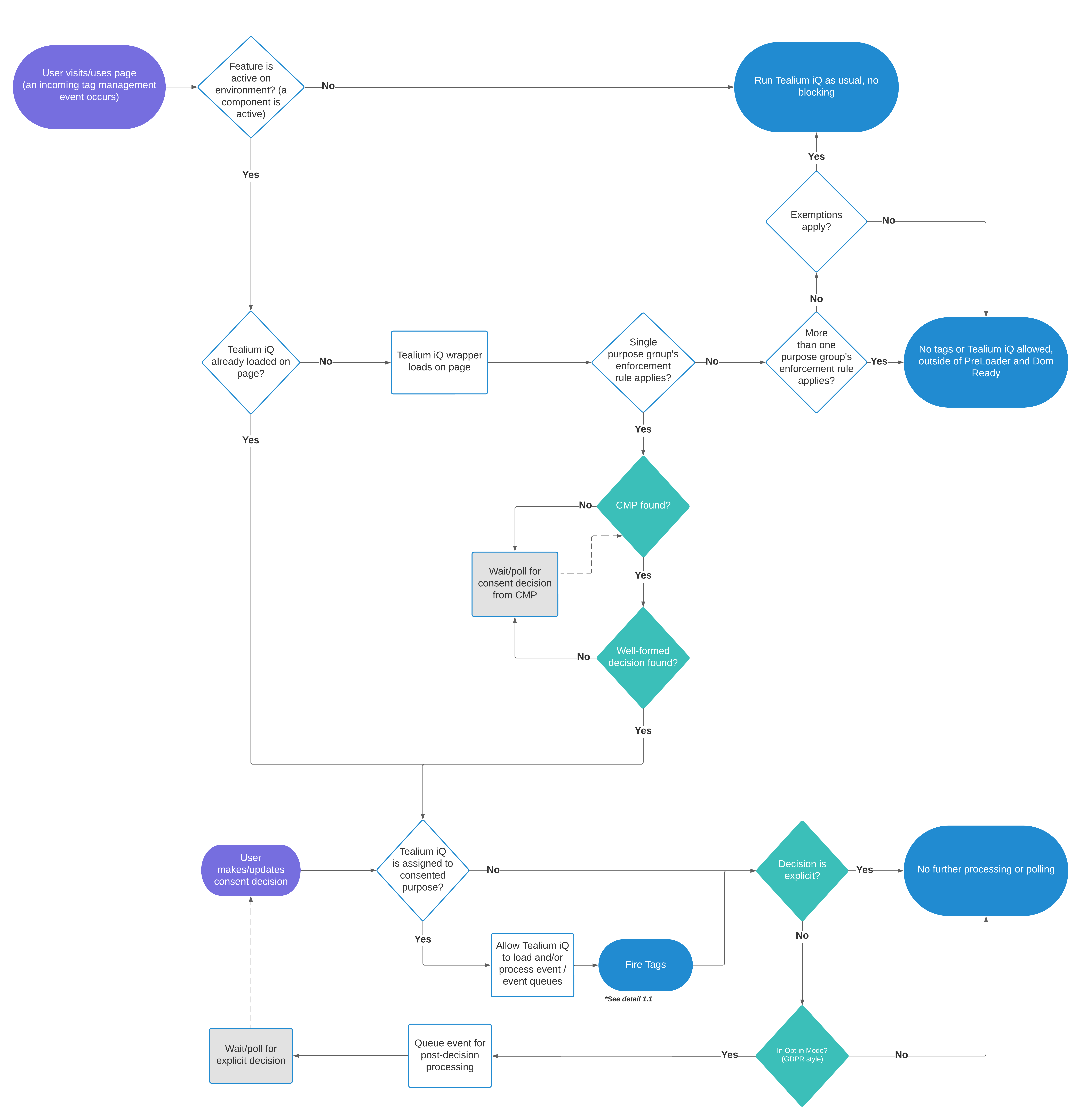 Tealium iQが最初にロードされた後に処理される新しいイベントについては、新しい同意決定がCMPから取得され、各イベントがTealium iQによって処理されるたびに、CMPが普遍的な真実の源として扱われることを確認します。