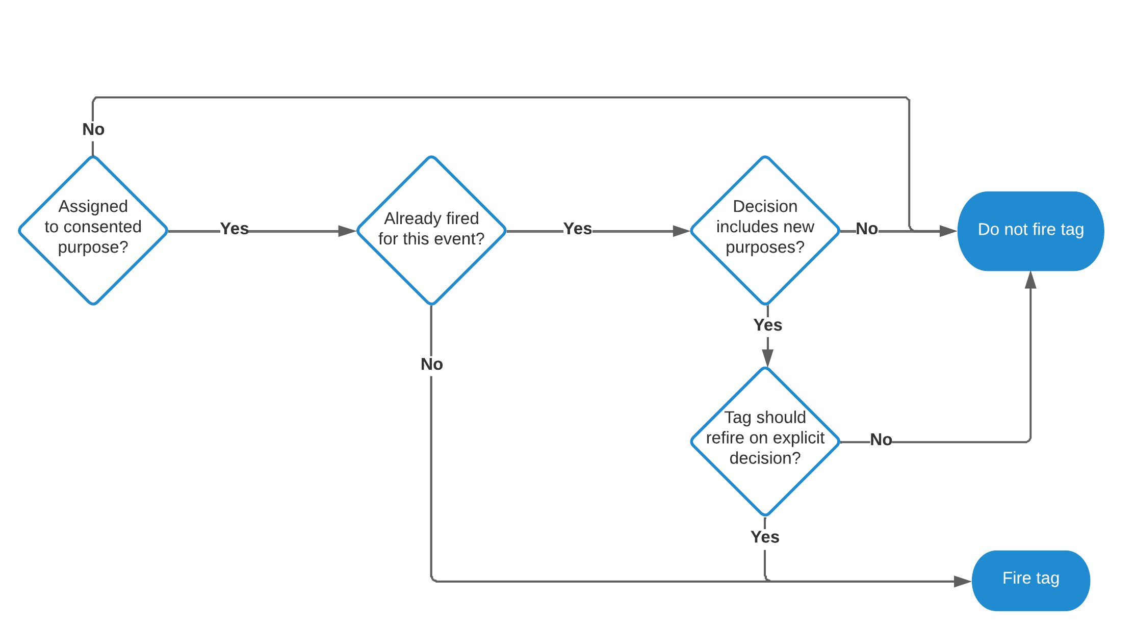同意決定が明示的な場合、すべてのキューは空になり、ポーリングは停止します。暗黙的な同意で発火されたタグは、明示的な同意決定が処理されるときに再発火されません(タグの再発火が有効で、処理する新たな同意目的がある場合を除く)。