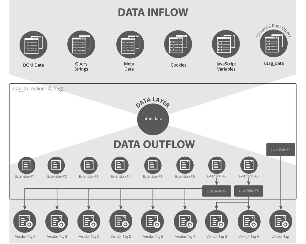 ウェブページにTealiumをインストールすると、データレイヤーオブジェクトは次のように動作します: