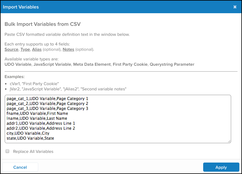 変数を個々に追加すると時間がかかることがあります。Tealium iQは、Bulk Import from CSVオプションを使用して一度に多数の変数を追加する簡単な方法を提供しています。