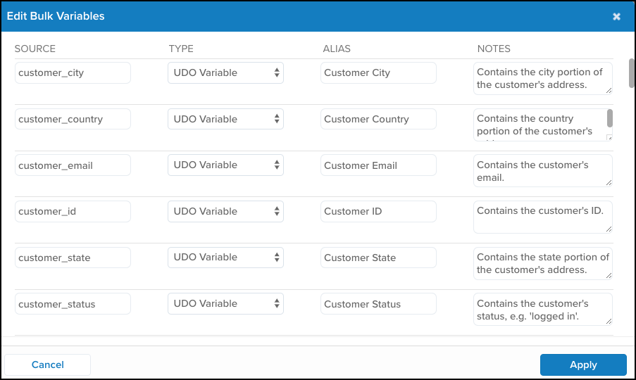 - Data LayerタブのEdit Allボタンをクリックします。Edit Bulk Variablesダイアログが表示され、ここから変更を行うことができます。