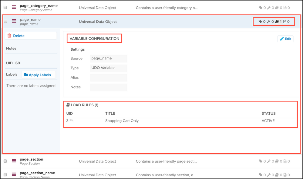 Data Layerタブでは、データレイヤー内の変数を管理するためのいくつかの方法が提供されています。ウェブサイトに実装した各変数は、構成で使用できるようにここで作成する必要があります。サイトのUniversal Data Object (UDO)に入れる動的データに加えて、この画面から追加できるページからの他の組み込み変数がいくつかあります。