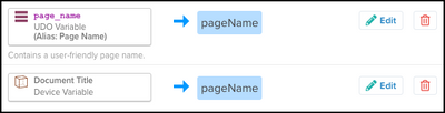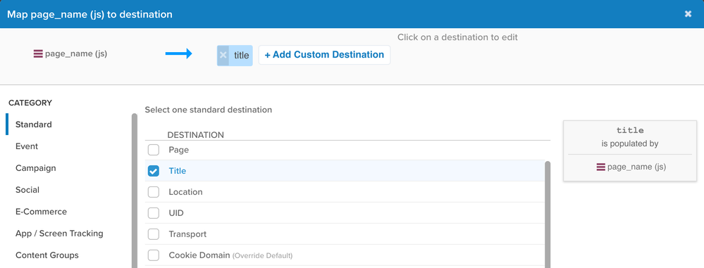 この例では、 page_name と Document Title の両方が入力されている場合、宛先変数 pageName は Document Title からの値を受け取ります。変数が入力されている場合、最後のマッピングが優先されます。