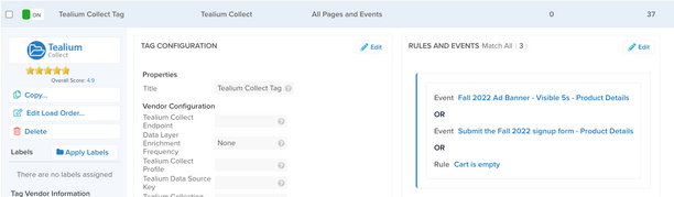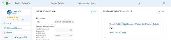 - Tealium CollectタグのルールとイベントリスナーにANDロジックで追加され、その他のタグルールとイベントリスナーは