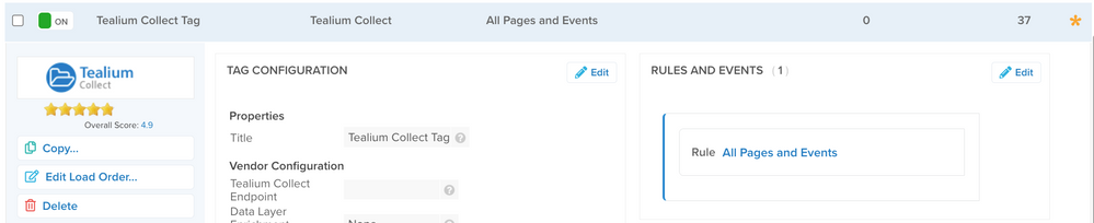 - ページ上にTealium Collectタグが存在し、All PagesとEvents(イベント)のロードルールを使用します。