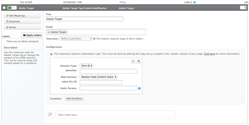 Adobe Test & Target タグ(以前はタグマーケットプレイスで “Adobe Target (async)” と “Adobe Target (sync)” の2つのバリアントとしてラベル付けされていた)は、Adobe Target のリリースにより非推奨となり、タグマーケットプレイスでは単に Adobe Target と呼ばれる単一のタグに置き換えられました。Tealium iQ プロファイル上の既存の Test & Target タグは、そのプロファイル上で Adobe Test & Target 拡張機能もアクティブである限り、引き続きアクティブであり、通常通り機能します。