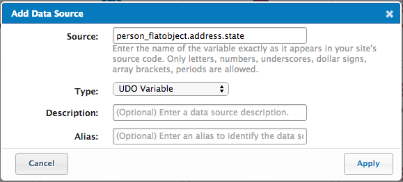 新しいオブジェクトから項目をデータレイヤー変数として参照する必要がある場合は、person_flatobjectで指定された表記を使用します。例えば、アドレスのstateデータにアクセスするにはperson_flatobject.address.stateとします。