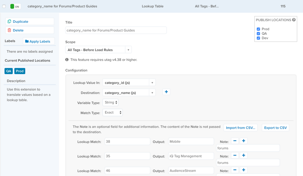 ルックアップテーブルは、Lookup Match フィールドと Output フィールドにルックアップ値と出力値のエントリを追加することで構成されます。上記の例から、ルックアップ値 35 は Lookup Match フィールドに表示され、出力値 iQ Tag Management は Output フィールドに表示されます。