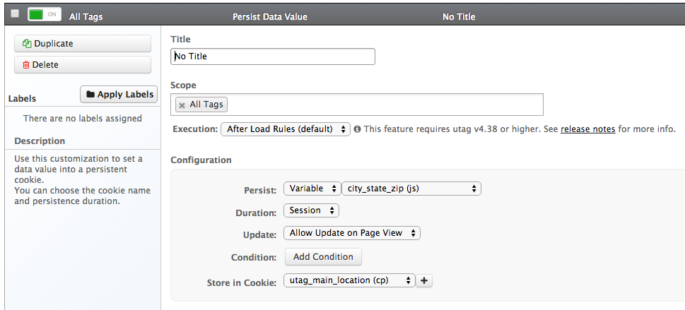 この例では、訪問の位置情報をクッキーに永続化する方法を示します。位置情報は、既存のデータレイヤー変数city_state_zipから取得されます。この変数は1ページだけで利用可能な場合がありますが、サイト全体のすべてのページで値が必要なため、データ値の永続化拡張を使用してセッションの寿命にわたってクッキーに保存します。