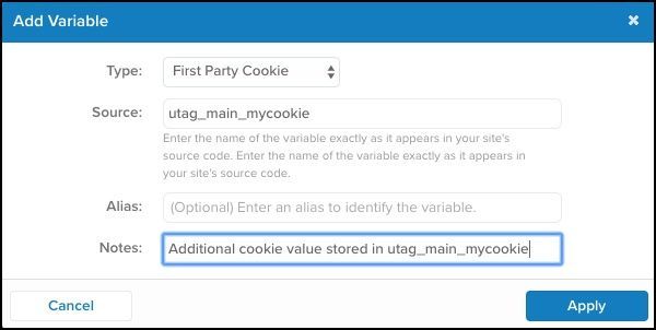 utag.jsのバージョン4.49以前では、Tealiumのクッキーはutag_mainという名前の単一のマルチバリュークッキーです。Tealiumのクッキーに値を保存するには、クッキー変数をutag_main_NAMEの形式で命名します。ここで、NAMEはクッキーの名前です。