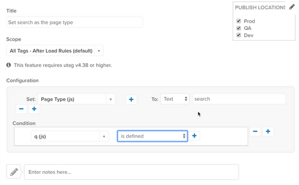 この例では、変数をテキスト値に構成する方法を示します。このシナリオでは、クエリストリングパラメータqが入力されているかどうかを検出するための条件が使用され、データレイヤー変数page_typeがテキスト値searchに構成され、これが検索結果ページであることを示します。