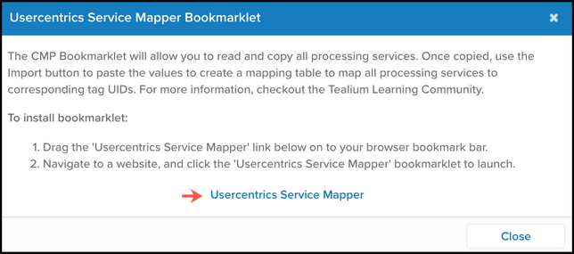 ブックマークレットがブラウザのバーに表示されます。 - 閉じるをクリックして、Usercentrics Service Mapperブックマークレットウィンドウを閉じます。