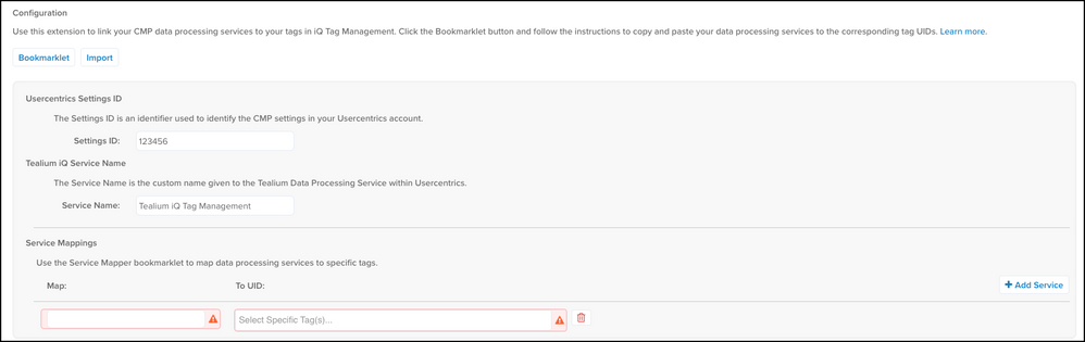 Usercentrics Settings IDとTealium iQサービス名が自動的に入力され、データ処理サービスへのマッピングがマッピングテーブルに表示されます。