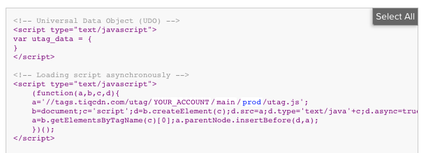 Tealiumスクリプトタブは、選択に基づいてコードを表示します。コードには、ユニバーサルデータオブジェクト(utag_dataのサンプル)とユニバーサルタグコード(utag.js)が含まれています。ここに表示されるユニバーサルデータオブジェクトは、データレイヤーで定義された変数から生成されます。