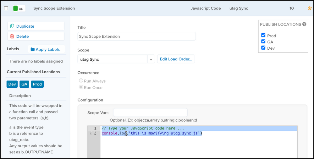 プロファイルでutag.sync.jsが有効化されると、その後のProd環境へのすべての公開にこのファイルが含まれます。AdvancedとBasicのJavaScript拡張機能は特定の環境への公開から制限することができ、これにより同期変更をデプロイする環境に対する制御がよりエンリッチメントされます。