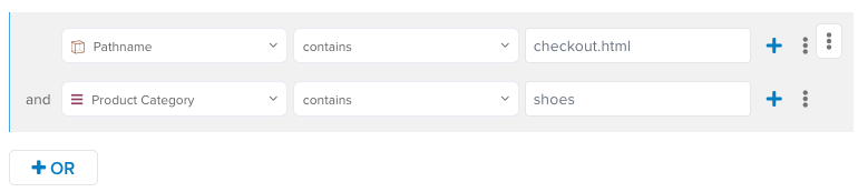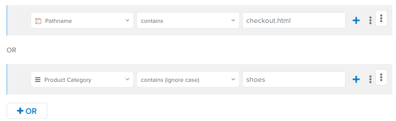 以下の例はOR条件を使用しています。このルールは、pathnameがcheckout.htmlを含む場合、またはproduct_categoryがshoesを含む場合に、ページ上のタグをロードします。ステートメントのいずれかが真であれば、ルールは真と評価されます。ORステートメントのすべてのステートメントが偽であれば、ロードルールは偽と評価されます。