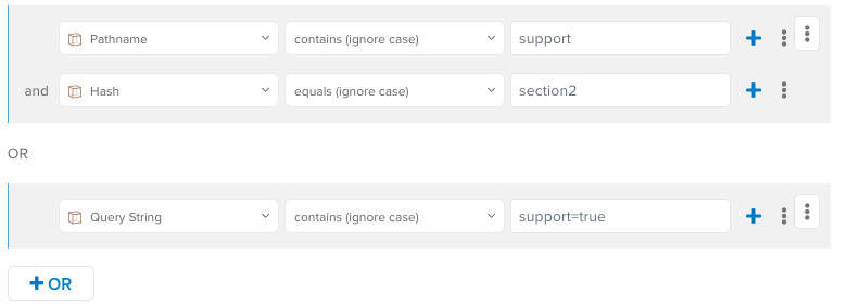 section2というセクションを含むsupportページ、またはクエリストリングがsupport=trueを含む場合にタグをロードするには、以下のルールを使用します: