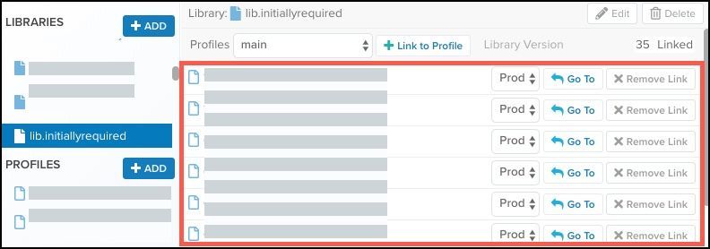 このライブラリにリンクされているプロファイルが右側のメインウィンドウに表示されます。ライブラリバージョン列は、プロファイルがリンクされているこのライブラリの公開環境を表示します。
