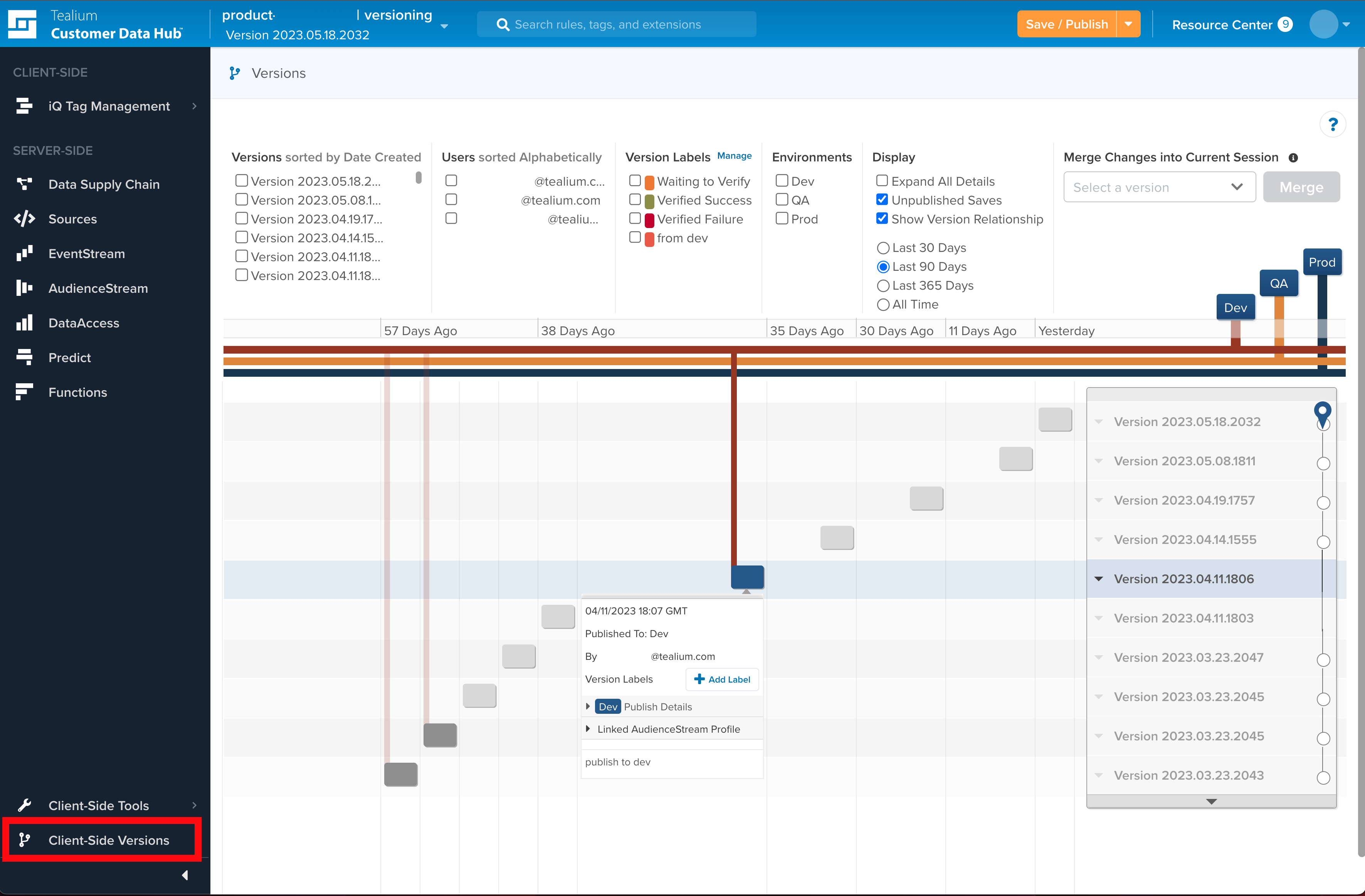 クライアントサイドバージョンに移動して、保存と公開の履歴を表示します。